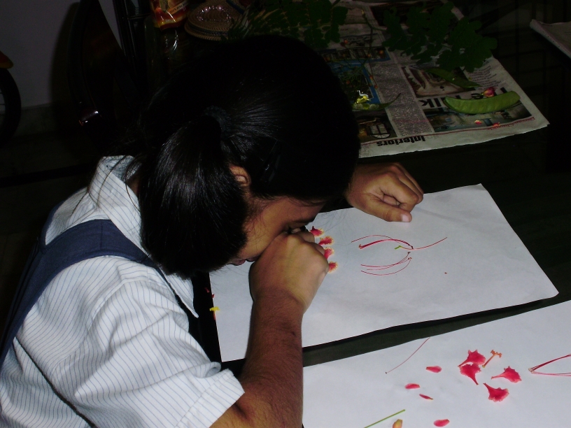 | A-D, clockwise from upper left: (A) A market scene just before Ganesh Chathurthi, a festival where statues of Lord Ganesha (the elephant god) are immersed in water. (B-C) Manaa viewing the flower parts of C. pulcherrima. (D) The other India: children collecting broken Ganesha idols and taking them to immerse in water. |