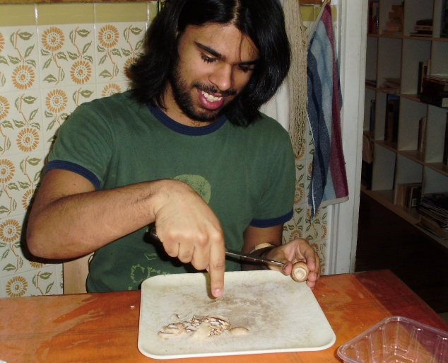 - Once the onions are soft and start to brown, add the white mushrooms and fry until the mushrooms soften.