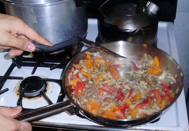 - Cut up the vegetables. Smaller is better, I like to cut the peppers into strips the size of whatever pasta I’m using.
