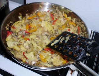 - Add the pickled artichokes and mushroom once the pasta is almost finished.