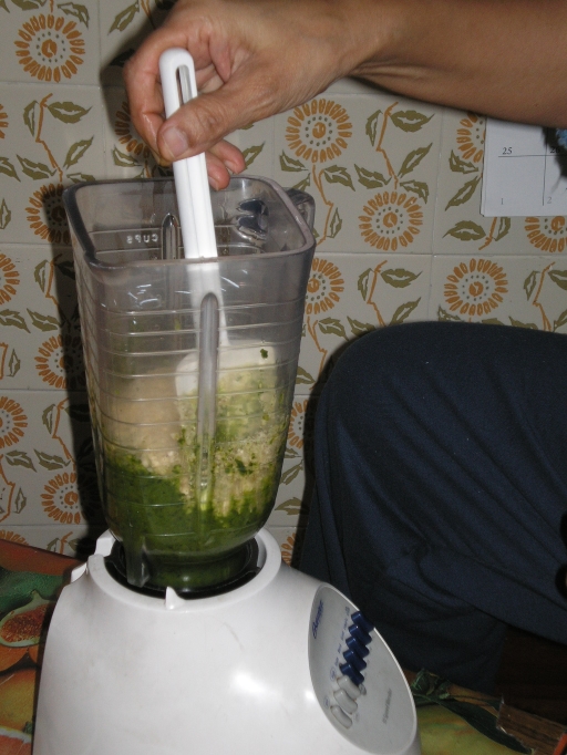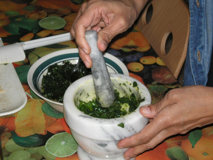 Pesto (Meher)1 Cup Olive oil All the ingredients need to be made into coarse paste. How you do this depends on the kind of food processors (Cuisinart, blender, mortar and pestle, etc.) you have. I use a pestle and mortar and a blender as follows. Using a mortar and pestle, crush the garlic coarsely. Set aside. Do the same with basil and parsley leaves. Add tiny bits of salt to the leaves while grinding them. Set aside. Chop pine nuts coarsely. Put olive oil, crushed garlic, basil, and parsley in a blender. Grind until you have a coarse paste. Add chopped pine nuts and cheese. Pulse the mixture until well combined. If needed, add a bit more olive oil to help grinding and combining. Do not puree. Pesto should be coarse. Pour in a jar. Add a thin layer of olive oil on the top to prevent the pesto from turning brown. Store in the refrigerator. Keeps for one or two months in the refrigerator. PS: For Adam's hot pasta salad, you need about a quarter of the pesto made with the above recipe. The rest can be stored and used as pasta sauce, pizza topper, etc. Always add a thin layer of olive oil before storing in the refrigerator. |