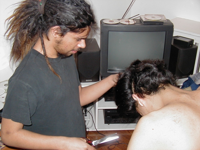 | This is a sequel to the dreadlocks story. I mentioned in the New year's letter that JS had been talking about undreading his hair after the “HAIR” performance was over (which, by the way, was absolutely wonderful). I was waiting for this event because I had felt that the dreads were a pain to wash and keep clean. As I wrote in the New year's letter, someone actually sells undreading stuff online. JS convinced Tim to order the undreading kit. Check their site to see the catchy labels on the bottles. [Unfortunately, the process was less photogenic (and took longer) than Adam's hair-razing, so there are no pictures to really document this process.] | ![]() |