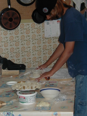 Then comes the assiduous process of rolling out the pie shells. Since Tim doesn't knead the dough at all, rolling out pie shells is a complicated process which involves rolling and surgically attaching the pieces which tear off, all the while wiping the profusion of sweat that forms on his brow.